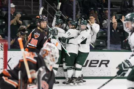 EAST LANSING - The Michigan State hockey team picked up its first win of the season on Friday night, topping Princeton 6-2 at Munn Ice Arena. Six different Spartans scored and five recorded multiple points in the win, which was keyed by a four-goal second period.