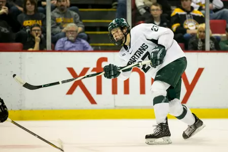 But the momentum shifted to MSU on a power play to start the third period. The Spartans won the faceoff by Sam Saliba and defenseman Zach Osburn's pass sent Mason Appleton in on a breakaway, and he fired the puck into the top right corner just seven seconds into the period. Suddenly, it was 4-2.