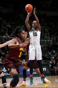 In the second quarter, Michigan State was able to player several players with 11 different players seeing action in the first 20 minutes. Redshirt-sophomore forward Victoria Gaines was solid in the second quarter with five points.