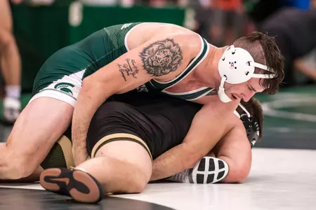 The Spartans took the first dual win of the season in a tiebreaker edge with Buffalo, 18-17 on Friday, Dec. 8. The teams split with five matches each, but Michigan State finished with the win on match points, 63-58. Major decisions from 141-pounder Javier Gasca and 157-pounder Jake Tucker helped the Spartans to victory, as well as decisions from 125-pounder Rayvon Foley, 165-pounder Logan Ritchie and 174-pounder Drew Hughes.